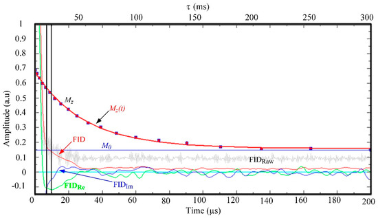 Due to the relatively poor signal-to-noise ratio and presence of high-frequency noise, some degree of noise elimination is required before obtaining the absolute value, otherwise the absolute value will have a positive offset. In Figure 19 are shown typical raw free induction decay signal (FIDraw), and the noise filtered signals: FIDRe, real part; FIDIm, imaginary part; and FID. It should be referred that the system is assembled in order to guarantee electromagnetic compatibility (EMC) among all the parts.