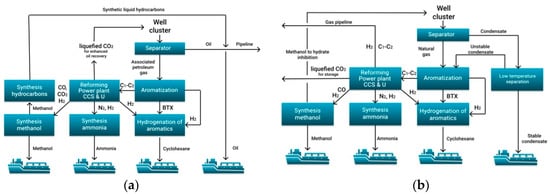 In these cases, it would be recommended to apply a Gas-To-Chem approach of creating installations, a concept developed in Saint-Petersburg Mining University. The proposed concepts for the development of remote Arctic oil and gas and gas condensate fields with the possibility of producing and transporting low-carbon products by tankers are presented in Figure 2a,b, respectively.