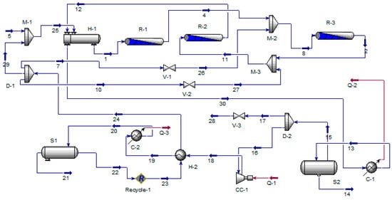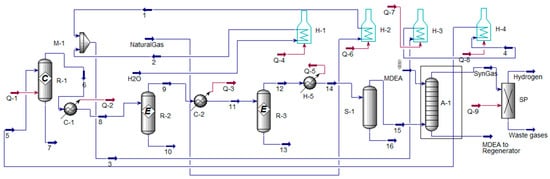 A schematic diagram of a methane steam reforming unit with water gas reforming reactors and amino purification is shown in Figure 3. Natural gas, over 90% methane, is mixed with the required amount of water vapor. The mixture is heated in heat exchangers H-1-5 and fed to the mixer M-1, where the prepared O2 mixture with an equal volume of water vapor is supplied. The conversion of methane with steam takes place in the R-1 reactor. Next, the products of conversion are sent to equilibrium reactors R-2-3 for the conversion of CO with water vapor and obtaining a mixture of carbon dioxide with hydrogen. In the absorber A-1, the mixture is separated into components by an aqueous solution of MDEA. After amine purification, the hydrogen-containing mixture is sent to a pressure swing adsorption unit (PSA) to obtain hydrogen with a purity of up to 99.999%.