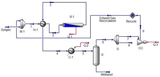 In the reforming unit, depending on the selected configuration of the equipment, it is proposed to use the technology of steam reforming or partial oxidation of C1–C2 components. It is important to note that in the production of hydrogen, it is possible to implement one of several methods of utilization of CO2 released from synthesis gas and exhaust gases of a power plant (except for injection into wells to maintain intra-reservoir pressure and increase oil recovery). The method consists in mixing in the presence of a catalyst hydrogen and carbon dioxide with the formation of products—water and carbon monoxide, which, when hydrogen is added, forms synthesis gas suitable for processing to produce methanol and motor fuels [,]. The produced synthesis gas will be next processed into methanol, Figure 4.