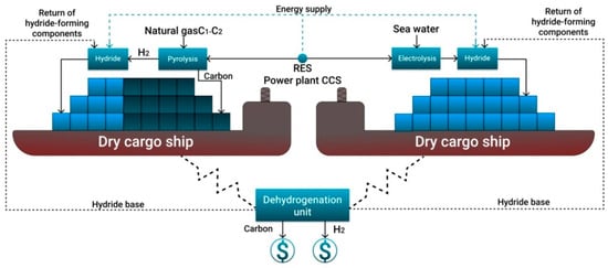 - Due to the lack of fleet for shipping of compressed or liquefied hydrogen, it is suggested to use tankers and dry cargo vessels for the transport of bound hydrogen in liquid and solid form. For the existing gas transportation systems and port infrastructure, it is proposed to use C1–C2 pyrolysis to obtain turquoise hydrogen and solid carbon from renewable energy sources and to ship the compressed carbon and hydrogen bound into hydride.