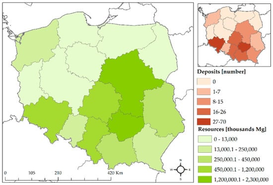 Locations of key raw material deposits in Poland, along with the spatial distribution of the deposits and the quantities of the resources (own study based on [14,15]).