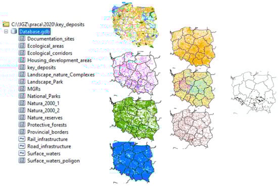 In the second step of the preliminary research, environmental and social elements were selected for research. By environmental variables, the authors understand all forms of environmental protection: national parks, nature reserves, nature monuments, landscape parks, the Natura 2000 areas, nature parks (protected landscape areas), landscape-nature complexes, ecological areas and documentation sites, forests with protective functions, indirect protection zones for groundwater and surface water intakes, major groundwater reservoirs, surface water reservoirs, rivers, streams and canals. Social variables, on the other hand, relate to objects, infrastructure or other elements of the environment directly related to the life of local residents and affecting the quality and comfort of their lives. They include criteria such as the distance from the deposit to the housing developments or transport-related accessibility. Additionally, a research method of examining documents was used to assess natural availability, which consists of collecting and analyzing the facts contained in it. The research was limited to the legal acts related to the establishment of individual forms of nature protection.
