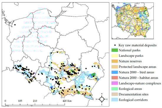 An additional issue is related to the restrictions on the exploitation of minerals in legally protected areas, which can be interpreted from the Nature Conservation Act of 16 April 2004 [17]. An obligatory prohibition on mineral exploitation applies to areas of national parks (including buffer zones) and nature reserves. An additional issue is related to the restrictions on the exploitation of minerals in legally protected areas, which can be interpreted from the Nature Conservation Act of 16 April 2004 [17]. As a result, extraction of minerals from 11 documented deposits will not be possible in these areas (Table 4).