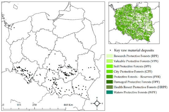 The limited accessibility of key raw materials and the depletion of the currently exploited deposits cause the attention to be drawn to resources in areas under various forms of protection: environment-, water- or forest-related. Therefore, it seems important to analyze the environmental accessibility of the analyzed deposits, which concerns four assumed aspects: forms of environmental protection, especially protected forests and surface waters, as well as main underground water reservoirs together with indirect protection zones for groundwater intakes. Environmental protection is significant for the maintenance and stability of ecosystems and ecological processes. The regulations regarding protected forests are of particular importance due to the fact that almost half of the forest-covered areas in Poland are protective forests which have primarily ecological and social functions [16]. Waters, on the other hand, prove vital for both residents and basic branches of economy. However, members of society should not forget that changing the location of a given mineral resource is not possible and if they want to maximize the benefits from the progress of civilization (based on mineral resources), a compromise must be found. Such a compromise may include an analysis of the accessibility of key raw material deposits performed among others from the environmental perspective.