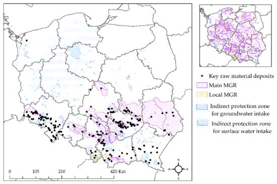 Locations of the analyzed deposits in MGR areas and in groundwater and surface water intake protection zones (own study based on [14]).