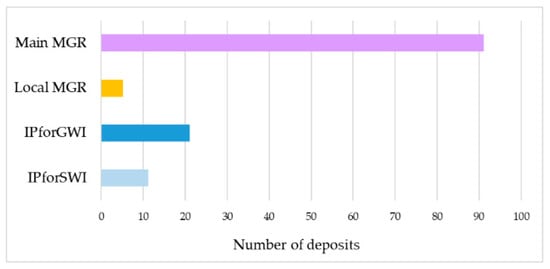 The analysis of the presence of deposits in the areas of major groundwater reservoirs showed that this fact applies to 96 deposits. On the other hand, 21 deposits are located in the indirect protection zones of groundwater intakes, and 11 deposits in the indirect protection zones of surface water intakes (Figure 9).
