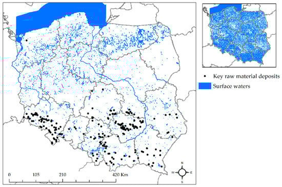 The analysis of surface waters included the presence of flowing (rivers and streams) and stagnant (reservoirs) water resources on the surface of documented key raw material deposits. The research demonstrated that no surface water reservoirs are present in the areas of the analyzed deposits (Figure 10). However, in 17 cases, flowing waters were identified on the surfaces of the analyzed deposits. The presence of surface waters in the documented areas of the analyzed deposits was included in a two-level scale for assessing their accessibility (Table 11).