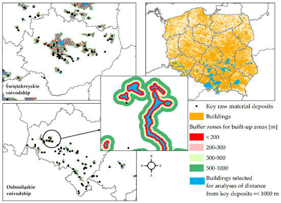The research on the accessibility of key raw material deposits concerned spatial and social aspects: the distance of the documented key raw material deposits from the nearest residential buildings as well as accessibility by road and rail. These factors were examined in terms of the impact of noise, the accessibility of road and rail transport, the latter being more beneficial for the local community. Road transport causes noise, vibrations, deterioration of the technical condition of roads or an increased nuisance for residents, and in the case of rail transport these aspects are not an issue or are much less important.