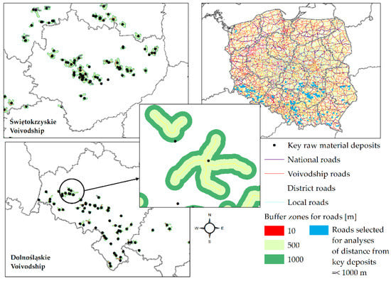 Analysis of transport-related accessibility of key raw material deposits—road infrastructure (own study based on [27]).