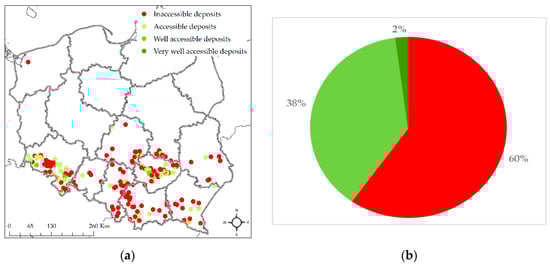 Results of the accessibility analysis of non-metallic raw material deposits in the environmental and social aspect in Poland—variant 2: spatial distribution of the classification result (a) and the percentage of the classification result (b).
