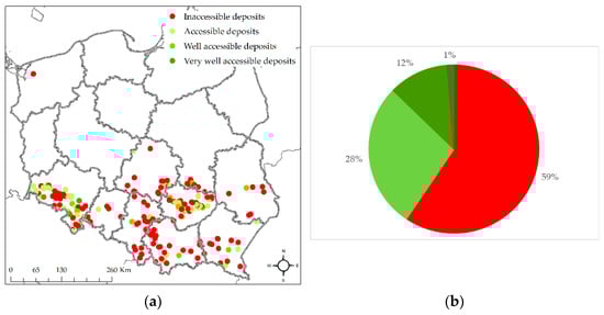 In the second variant of deposit accessibility evaluation, the railway infrastructure was not assessed. The railway infrastructure in the vicinity of the deposit was assumed not to be a decisive factor for its accessibility, as in most cases (90%) non-metallic raw materials are transported with the use of road vehicles [32]. As a result, the second variant was performed for six variables. The results in this variant were as follows: 145 deposits were classified as inaccessible, 68 deposits—as accessible deposits, 28 deposits—as well accessible deposits, and 3 deposits—as very well accessible deposits. Figure 15 shows the spatial distribution of the deposits according to the results.