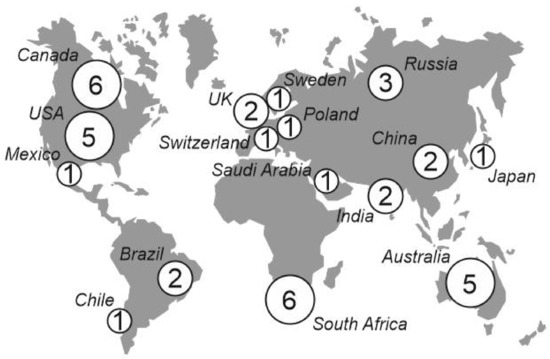 Geographical distribution of the analyzed world’s forty top mining companies.