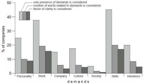 JC-WPs, which seem to be essential sources of information on personnel demands as well as objects of employees’ attention [15,49], were examined qualitatively to find the statements related to the desired basic characteristics of employees. In certain cases, these characteristics are indicated precisely, but in other cases, the texts need “light” interpretation. Moreover, several companies have web pages on which such statements are lacking, or where JC-WPs are not present at all. Such companies had to be excluded from our analysis, which resulted in an analysis that includes forty organizations. For each of them, the three most clearly expressed general demands have been taken for analysis; this restriction was chosen in order to avoid a too large data heterogeneity, and in the majority of cases, the number of well-expressed demands does not exceed the maximum of three.