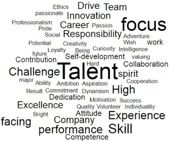 In most cases, the leaders of the global mining industry, taken together as a group, demonstrate a wide spectrum of preferences regarding personnel. The “word cloud” shows that the most frequently used word is “talent” (Figure 3), which is attributed provisionally to the basic category of skills (such an attribution does not mean that talent and skills are the same) (Table 1). Its frequency is high in comparison to the other words (“focus” is also a frequently stated word, but this is due to its presence in different stated demands—see Table 1) that one may judge the analyzed companies as talent-concerned. The relatively frequent attention for high performance and challenge facing (Figure 3) indicates interest in the basic category of work (Table 1). Apart from these demands that are frequently stated, the frequency of the majority of the words regarding specific demands is low or moderate (Figure 3).