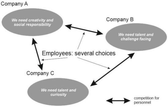 The weak coherence of the disclosed expectations found in the present study indicates differences in the strategic vision of the companies regarding the desired personnel, which faces the latter with a situation in which they have several choices; personal characteristics of potential employees seem appropriate for the application for several positions in several companies (Figure 4). Concerning the limited size of the labor market (e.g., [84,85,86]), it appears that the leading companies must compete for the available personnel.