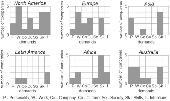 The mining companies under study are located in different parts of the world (Figure 1). It is therefore interesting to find out whether the geographic locations influence the demands on employees. It is established that such an influence exists and that the geographic differences between the general demands are significant (Figure 6). Demands regarding personal skills exist everywhere except for Latin America. Work dedication is especially valued by North American, European, and Australian companies. Personality is less a point of concern in Europe, Africa, and Latin America. Of much interest is the attention to the company’s culture. This appears relatively significant in North America and Europe, whereas it seems insignificant in Asia, Latin America, and Africa. It should be mentioned in this context that Latin American companies pay most attention to the employees’ life/career expectations, although only several companies are considered (because of their low number among global leaders).