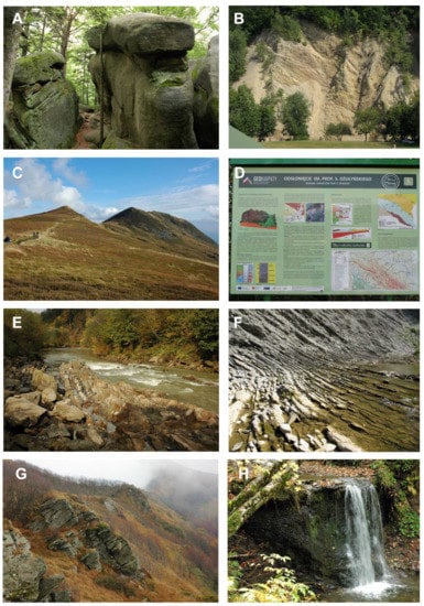 Examples of valuable geoheritage sites in the area of the potential geoparks. (A) rock forms in the Diabli Kamień Nature Reserve; (B) flysch rock outcrop on the slopes of the Wisłok valley in Rudawka Rymanowska; (C) Tarnica, the highest peak of the Bieszczady Mountains; (D) example of an interpretation panel of the GeoKarpaty trail, (E) Sine Wiry Nature Reserve; (F) the rocky channel of the Wisłok river; (G) rock form outcrops along the ridges of the Bieszczady Mountains; (H) waterfall in Bieszczady Mts. (photo by: W. Zgłobicki and B. Baran-Zgłobicka).
