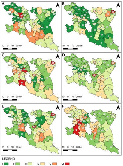 Differences in potential among the studied districts: (A) potential of geodiversity; (B) potential of animate nature; (C) cultural potential; (D) the potential of tourist attractiveness; (E) potential of tourist infrastructure; (F) development potential. Potential: I—very low, II—low, III—moderate, IV—moderately high, V—high, VI—very high. Districts: 1. Baligród; 2. Besko; 3. Bircza; 4. Brzostek; 5. Brzozów; 6. Chorkówka; 7. Cisna; 8. Czarna; 9. Domaradz; 10. Dubiecko; 11. Dukla; 12. Dynów; 13. Dynów—city; 14. Fredropol; 15. Frysztak; 16. Haczów; 17. Iwonicz Zdrój; 18. Jaśliska; 19. Jasło; 20. Jasienica Rosielna; 21. Jedlicze; 22. Komańcza; 23. Korczyna; 24. Krasiczyn; 25. Krempna; 26. Krościenko Wyżne; 27. Krosno; 28. Krzywcza; 29. Lesko; 30. Lutowiska; 31. Miejsce Piastowe; 32. Niebylec; 33. Olszanica; 34. Przemyśl; 35. Przemyśl-city; 36. Rymanów; 37. Sanok; 38. Sanok-city; 39. Solina; 40. Strzyżów; 41. Tyrawa Wołoska; 42. Ustrzyki Dolne; 43. Wiśniowa; 44. Wielopole Skrzyńskie; 45. Wojaszówka; 46. Zagórz.