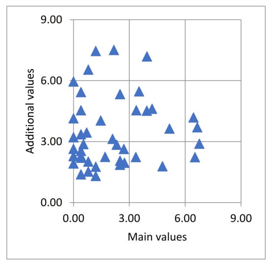 To carry out a comprehensive assessment of the potential of the districts under study, a two-dimensional matrix was prepared based on geodiversity potential and additional values (Figure 6). The largest cluster of districts has low potentials (18 districts in categories I and II); another twelve districts belong to a cluster with medium or high potential (categories III to VI). According to the adopted methodological framework, high potential (categories V and VI) of the main and additional values does not occur in any of the districts under study (Figure 6).