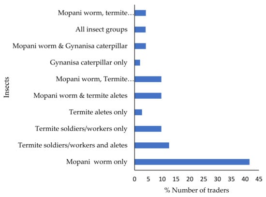 Of the traders, 42% only sold mopane worms, followed by traders that sold a combination of termites (13%), and traders that sold a combination of mopani worm and termites (10%). In contrast, fewer traders (2%) only sold Gynanisa caterpillars (Figure 1).
