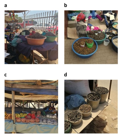 Conditions of informal markets where edible insects are sold in the towns of Vhembe district, South Africa: (a) Thohoyandou, (b) Makhado, (c) Elim, and (d) Sibasa.
