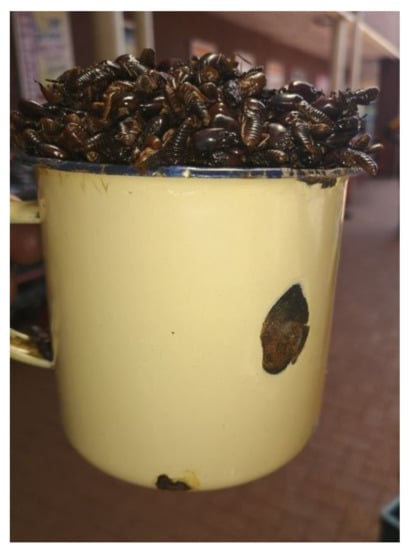 Edible-insect trading is a good business that generates income and improves livelihoods in rural communities. The generated income from edible insects varies from species to species. For instance, Gonimbrasia belina (mopane worm) is an economically important caterpillar in southern Africa, which plays a vital role in rural income generation [17,18,19]. Approximately 16,000 metric tons of mopane worms are traded per year, resulting in an income generation of about USD 39 million to 59 million a year in southern Africa [20]. Mopane worm traders in the town of Thohoyandou in the Limpopo province of South Africa can each generate an income of approximately USD 1393 (about ZAR 21,060) per year [21]. Other economically important species include termites, which are widely consumed across Africa, creating earning opportunities for rural traders and harvesters [12,22,23].