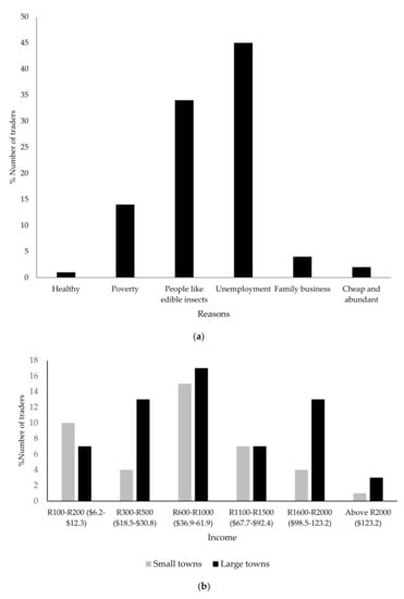 Most traders (60%) cited that trading insects provided financial support, while 35% cited that they use money generated from trading insects to pay school fees and electricity, and buy household items. However, 5% mentioned that they do not benefit much from selling insects. Of the traders, 3% earned over ZAR 2000 (USD 123) per week in large towns, while only 1% of the traders earned over ZAR 2000 (USD 123) per week in small towns (Figure 4b).