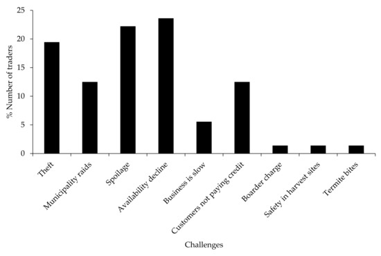 Most traders (24%) cited that the decline in the availability of edible insects from the wild and insect spoilage (22%) were the major challenges associated with trading insects. Fewer traders (1%) cited safety and termite bites as challenges associated with trading insects (Figure 5).