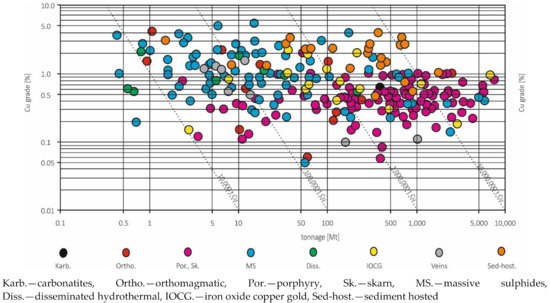 Each type of deposit is characterized by individual qualitative and quantitative characteristics. Apart from geological features, deposits resources and ore quality are determined by economic factors and individual balance criteria. Grade tonnage of major copper deposits in the world by deposit type or source is illustrated in Figure 1.