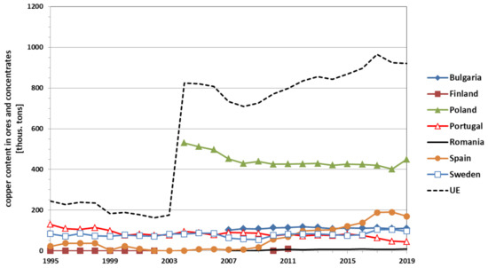 The European Union, established in the 1950s on the basis of the European Coal and Steel Community and the European Economic Community, initially provided a negligible amount of mining copper. Low levels of mining production were recorded in France, Germany, and Italy. With time, as the EU structures expanded, the addition of new countries, much richer in copper ore deposits, contributed to the increased importance of the EU in international markets, especially in Europe (see Table 1, Figure 2). The most significant additions have been those of Portugal and Spain (since January 1986), Finland and Sweden (since January 1995), Poland (since April 2004), and Bulgaria (since January 2007).