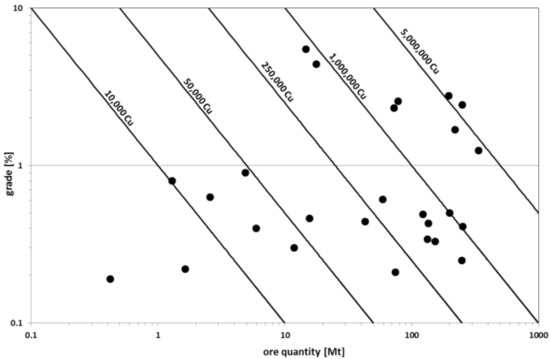 Grade versus tonnage of major copper deposits, based on [32], simplified.