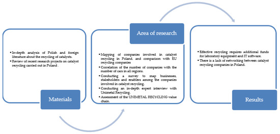 First, an analysis of the catalyst market (2015–2020) was carried out, focusing on cooperation in the value chain and industrial symbiosis with in-depth analysis of Polish and foreign literature. It allowed the technological challenges, environmental hotspots, legal constraints and economic instruments promoting cooperation and networking to be identified. Moreover, in order to analyse future trends in catalyst technology and the market in Poland, a review was carried out of recent R&D projects which obtained financial support from different research funds in Poland (more information in Supplementary Materials). This shows that they mostly focus on the improvement of catalyst quality or the development of new recycling technology; none look at substitution. There is no official network or association in Poland, but some companies are members of the Waste Recycling and Management Cluster—a key national cluster.