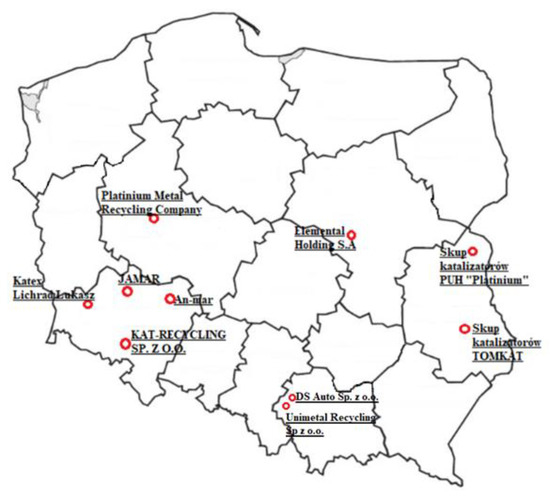 Zhang et al. note that future demand for these critical metals will increase in the years to come [1]. Molnár and Papp [10] show the development and implementation solutions that would minimise the impact of the growing number of cars on the environment, confirmed by the U.S. Geological Survey data, i.e., increasing worldwide trends in relation to the recovery of PGMs from end-of-life cars [13]. Yakoumis et al. predict the increasing demand for PGMs in the years to come [17]. Zhang et al., Puig and Alvarado analyse the development of technological solutions for individual metals, i.e., the recycling of palladium or platinum [25,26]. In Poland the catalyst recycling market is relatively new. Companies located in Poland have been on the market for up to 10 years (Supplementary Materials). As shown in Figure 2, they are only located in a few provinces. This provides opportunities for further development of the market in other areas in Poland.