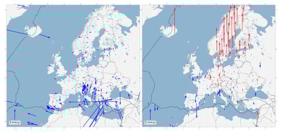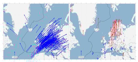 Because ETRFyy is realised and maintained by stations located on the European territory, the velocities are much smaller than those in the global ITRFyy. Figure 3 shows the ETRF2014 horizontal velocity field (left) and vertical velocity (right) derived from the latest EPN cumulative solution. Note that the scale of horizontal displacements in Figure 1 (left) and Figure 3 (left) are different. Most of the European territory has <1 mm/year horizontal and vertical velocities. In the case of horizontal velocities, only a couple of stations, located in Turkey and the Apennine and Balkan Peninsulas, experience velocities significantly larger than 1 mm/year. As can be observed, the vector directions have a stochastic character. Therefore, in addition to global and local tectonic plate movements, the error in velocity determination must be taken into account for these stations. In the case of vertical displacement, for both ITRF2014 and ETRF2014 the velocity magnitudes are at the 1–2 mm/year level, except for the Fennoscandia region (the region including the Scandinavian Peninsula, Finland, Karelia and the Kola Peninsula) and Icelandic territory, which are uplifted against the rest of the European territory [42,43].