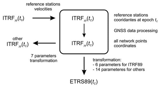 - GNSS solutions are processed in ITRFyy (e.g., ITRF2008) and the target ETRS89 reference frame is ETRFxx (e.g., ETRF2000), which do not correspond to the ITRFyy. Calculations are made in two steps: transforming coordinates at the epoch from ITRFyy into ITRFxx using Equation (1) and from epoch to epoch . The second step is similar to Point 1, by using Equations (3) and (4).