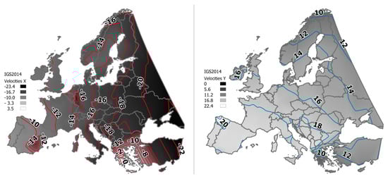 European plate velocities (mm/year) in IGS14: X component (left); and Y component (right) (own study based on [41]).