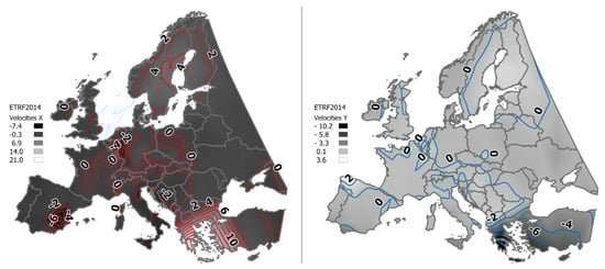 Based on the multi-year observations from 249 permanent reference stations covering the European continent, their positions and velocities are determined and made publicly available in both global (IGS14) and local (ETRF2000 or ETRF2014) reference frames at epoch 2010.0 [41]. Based on these products, the tectonic plate movements and velocities are computed, and contour values of the velocities are illustrated in Figure 4 and Figure 5. Since the point coordinates of parcel’s boundaries are shown in plane coordinates (X and Y), only these are analysed.
