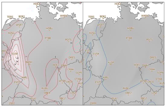 Velocities (mm/year) in ETRF2014 ((left) X component; and (right) Y component) in Germany: In the Ruhr Region (EUSK station), mining activities were performed for many years, and their influence is still noticeable (own study based on [41]).