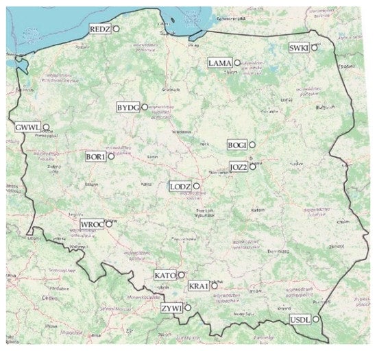 In the analysis, we focus on the territory of Poland. It is located in the centre of Europe and it does not have any significant anomalous sub-areas. The impact of mining is significantly lower than in other areas, such as the Ruhr Region. Only the EPN station (KATO) in this area has an X velocity value of 1.6 mm/year (ETRF2014), whereas the rest of the stations do not exceed 1 mm/year. Figure 7 gives the EPN stations’ location and Table 1 shows velocities in this area.