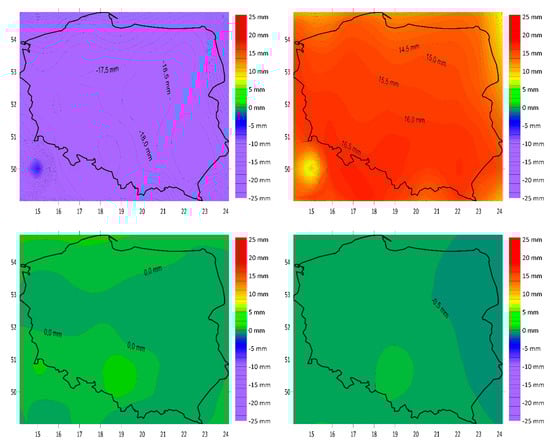 The plate movements for the area of Poland: (top) IGS2014 X (left) and Y (right) components; and (bottom) ETRF2014 X (left) and Y (right) components (own study, based on [41]).