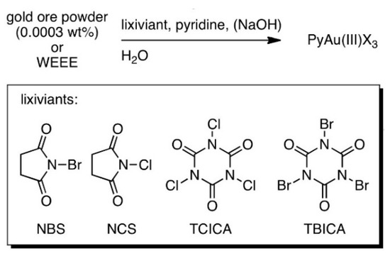 TCICA—Method 1: To a suspension of WEEE dust (100 mg, 0.0005 mmol Au) in water (50 mL) at room temperature were added pyridine (0.3 mL, 3.8 mmol) and TCICA (60 mg, 0.50 mmol). The resultant mixture was stirred at room temperature and 400 rpm for 24 h. The solids were removed via filtration and the filtrate was subjected to ICP-MS analysis.