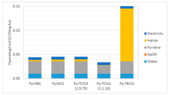 Operating cost breakdown (expressed in GBP/10 mg of processed Au) for the minimum profitable yield for each system.