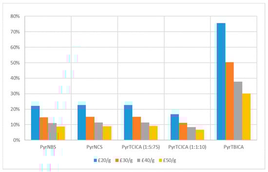 The profitability of the process is also closely related to the price of gold, which was assumed to be GBP 30/g, However, over the last 10 years, the price of gold ranged from USD 864/oz (approximately GBP23/g in current prices) to USD 2062/oz (approximately GBP 56/g), using historical data retrieved from online resources. These fluctuations make the gold price the parameter with the highest uncertainty in the profitability analysis performed. For that reason, a sensitivity analysis of the minimum profitable yield was performed with the price of gold ranging between GBP 20/g and GBP 50/g. The results show that even in the worst case (by gold price reaching an historical low), the minimum profitable yield for all three methods does not exceed 25% (Figure 3). This enhances the previously drawn conclusions that a potential scaled-up facility using NBS–pyridine as the main gold extraction system would be profitable and more environmentally friendly than the currently used ones. Moreover, less toxic solutions (e.g., use of a common pool cleaner/TCICA) cannot be disregarded. Although, the achieved extraction is lower compared to the N-bromo or chloro compounds, the fact that it is slightly cheaper and has a smaller toxicity impact could affect the final decision.