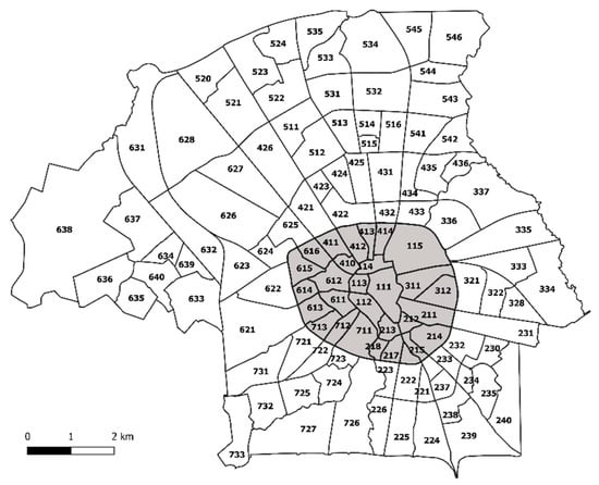 Eindhoven is located in the North Brabant province, in the southern part of The Netherlands, and is the country’s fifth-largest city, with an area of 89 km2 and 224,755 inhabitants in 2016 [,]. Eindhoven is divided into 116 administrative boroughs or neighborhoods, of which 29 constitute the city center (Figure 1).