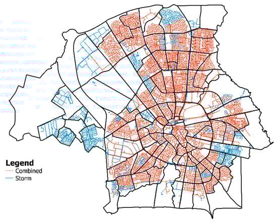 Like in many other modern European cities, urban development in Eindhoven has not been accompanied by an adequate expansion and upgrading of the sewer and stormwater networks [,]. Only 28% of the combined sewer–stormwater network shown in Figure 2 has a separate collection of the surface runoff and the sewage water.