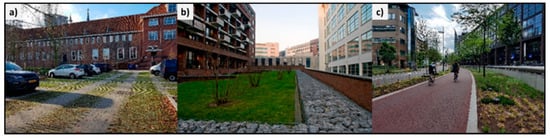 Examples of NBS that are planned in Eindhoven: (a) Vegetated grid pavement; (b) Green roof; (c) Water storage on the streets (Photos from Luuk Postmes).