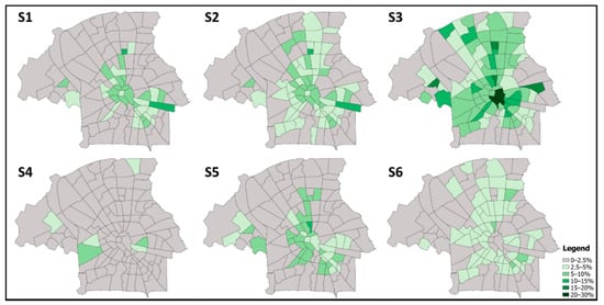 NBS percentage distribution for scenarios S1 to S6, in the various neighborhoods of Eindhoven.