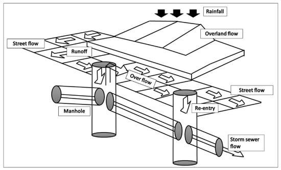 Here, the model was applied to the “baseline” conditions in 2018 as well as for the six NBS scenarios listed in Table 1. The runoff was computed for each sub-catchment using the Desbordes flow model, while the infiltration was calculated using the Horton infiltration model []. The runoff of rainwater towards the sewer system was determined on basis of the surface properties of each sub-catchment, in particular infiltration, surface storage, and discharge delay. These properties depend on the type of surface and the slope of the terrain. The runoff of a sub-catchment is then routed towards inlet points into the sewer system, using a coupling map indicating the inlet points. In case the runoff in the sewer system (1D) exceeds its transport capacity, the sewer system can become surcharged/pressurized and the pipes completely filled. Under such circumstances, water might flow out to the surface network (2D) at the linking elements such as manholes or inlets and, ultimately, cause street flooding. Weir/orifice flow equations were used to simulate the flow exchange between the surface and subsurface networks (Figure 6).