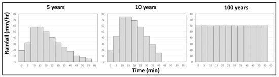 The simulations for baseline conditions and the six NBS scenarios were carried out for three design rainfall events with return periods of 5, 10, and 100 years, following the national Dutch guidelines for sewage design [,]. These synthetic design hyetographs are presented in Figure 8. They assumed homogeneous rainfall fall over the entire area of Eindhoven, which is hardly realistic and possibly resulted in an overestimation of possible flooding.